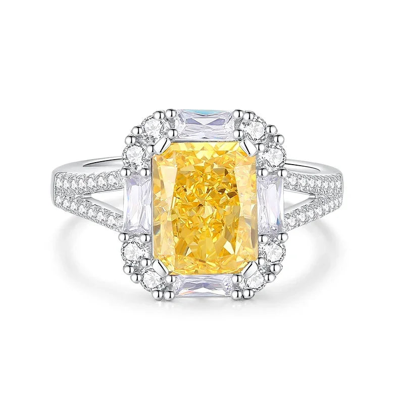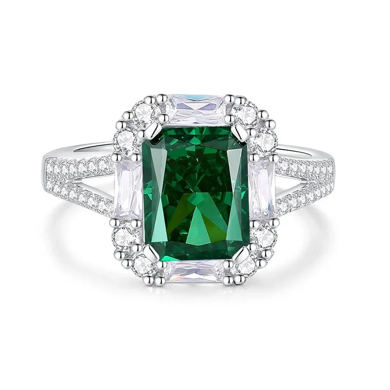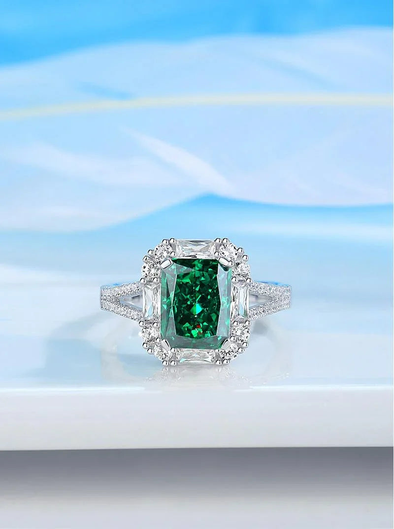 The center stone is elevated by a modern gallery of baguette and square-cut Liora gems – not accents, but intentional artistic elements. Each gem is: